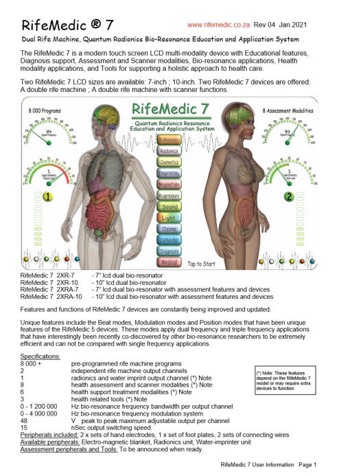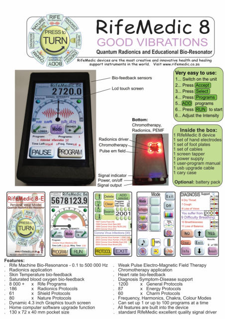 RifeMedic’s are Alternative- Scientific- Educational- Health-Enhancement Devices that function with frequencies, resonance, biological energy fields, as well as environmental and holographic aspects of the body and its environment. RifeMedic devices are creative and good quality instruments that may perform various functions, intended for the personal use of individuals to enhance the health of humans as well as fauna and flora. RifeMedic’s are not medical devices. These devices are designed, manufactured and tested to comply with type BF safety requirements.